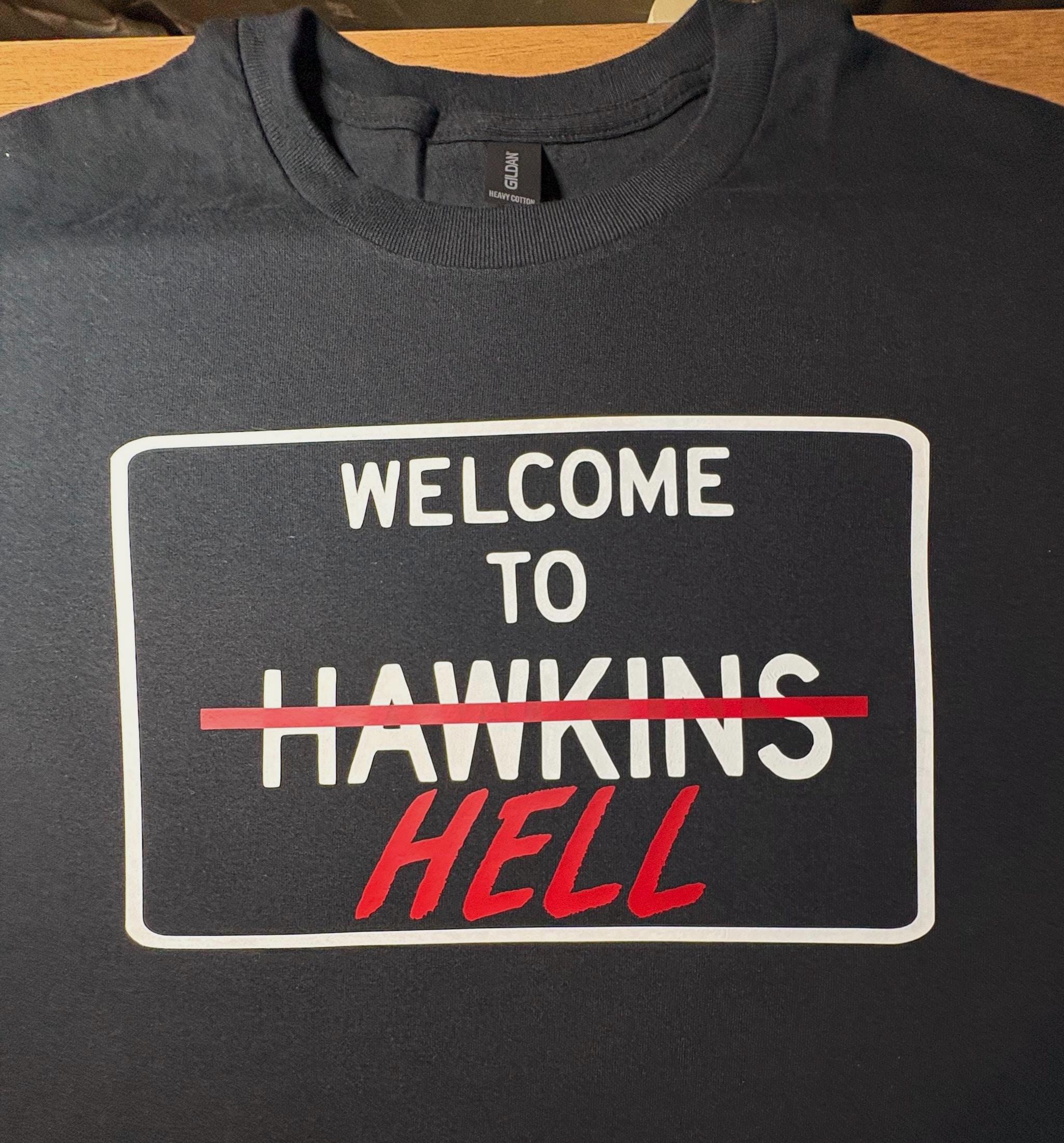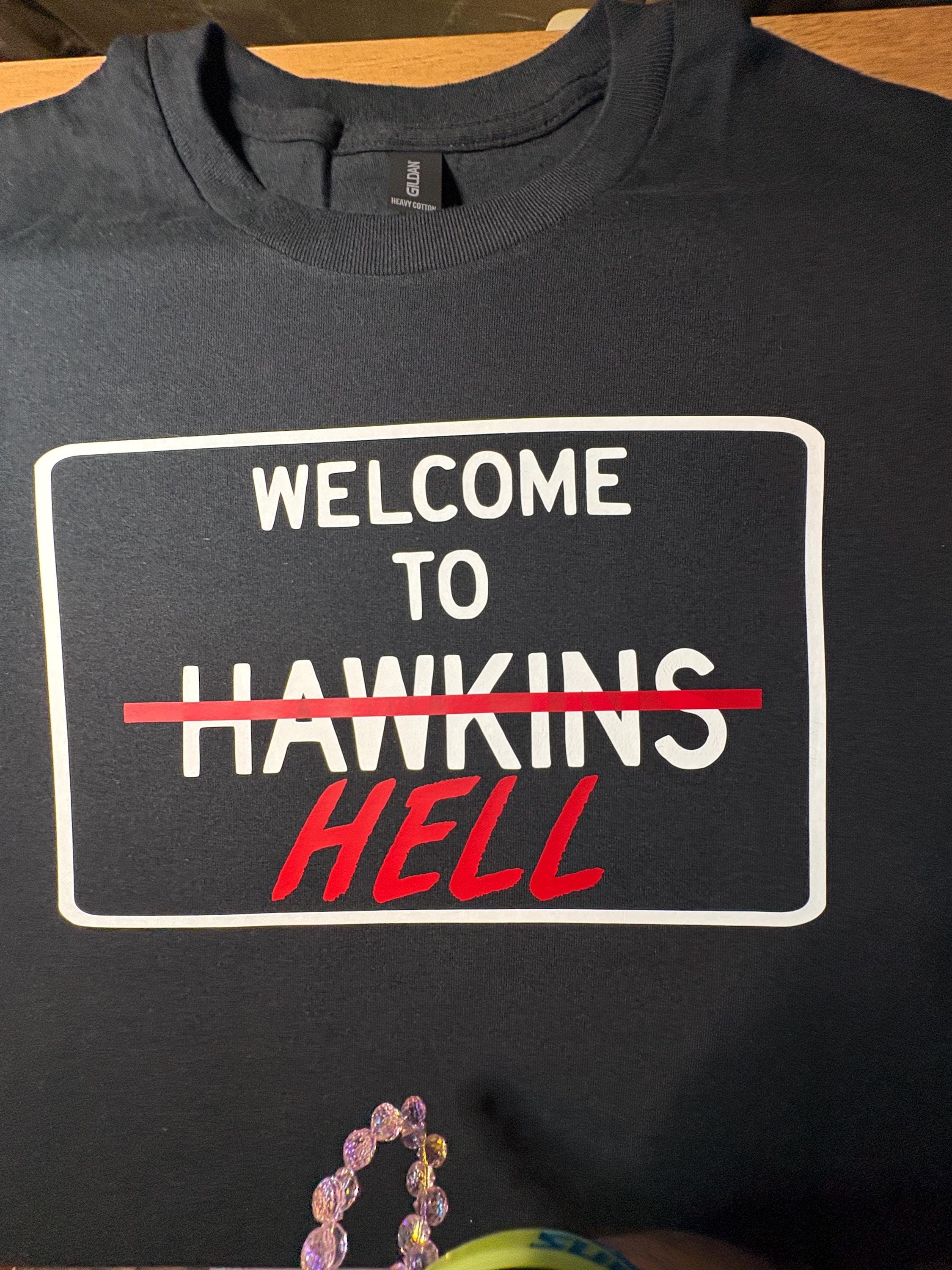 Stranger things*Welcome to Hawkins/Hell* design can be made any color shirt and/or any color design.